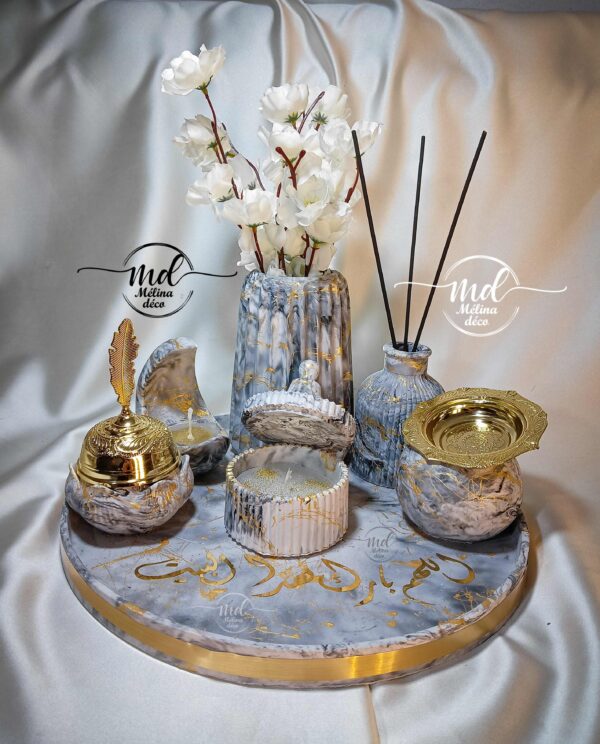 🩵 طقم فاخر باللون الرخامي بالذهبي – 7 قطع أنيقة